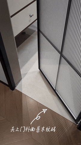 像网友 @海星贝贝 家这么,木纹砖与卫生间瓷砖不息,木纹砖往里贴2厘米,两种瓷砖接壤处刚好在门下,关上门外面是木纹砖,内部是卫生间砖,获取两个齐备孤独的空间。
