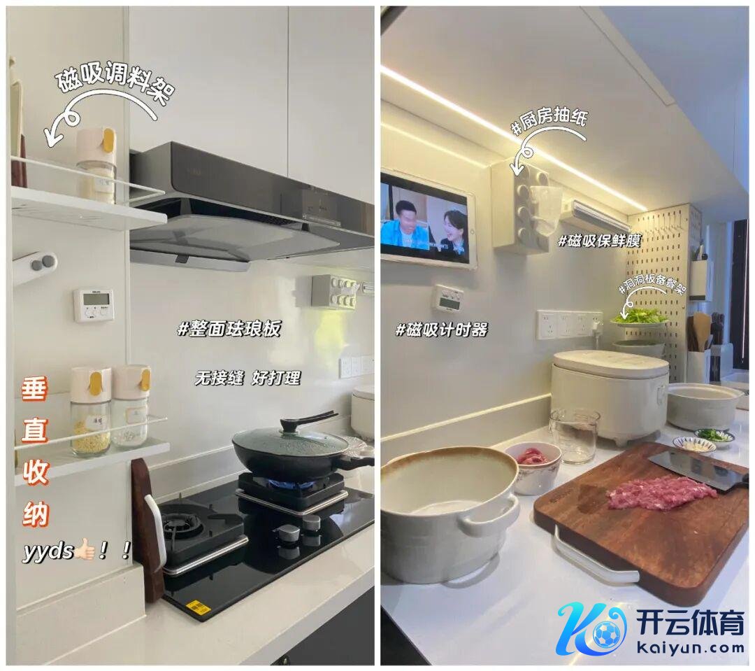不仅如斯,给厨房墙面装配上搪瓷板后,像一些常用的物品都不错磁吸到墙面上,不仅开释了台面空间,还抗污抗脏好收拾。