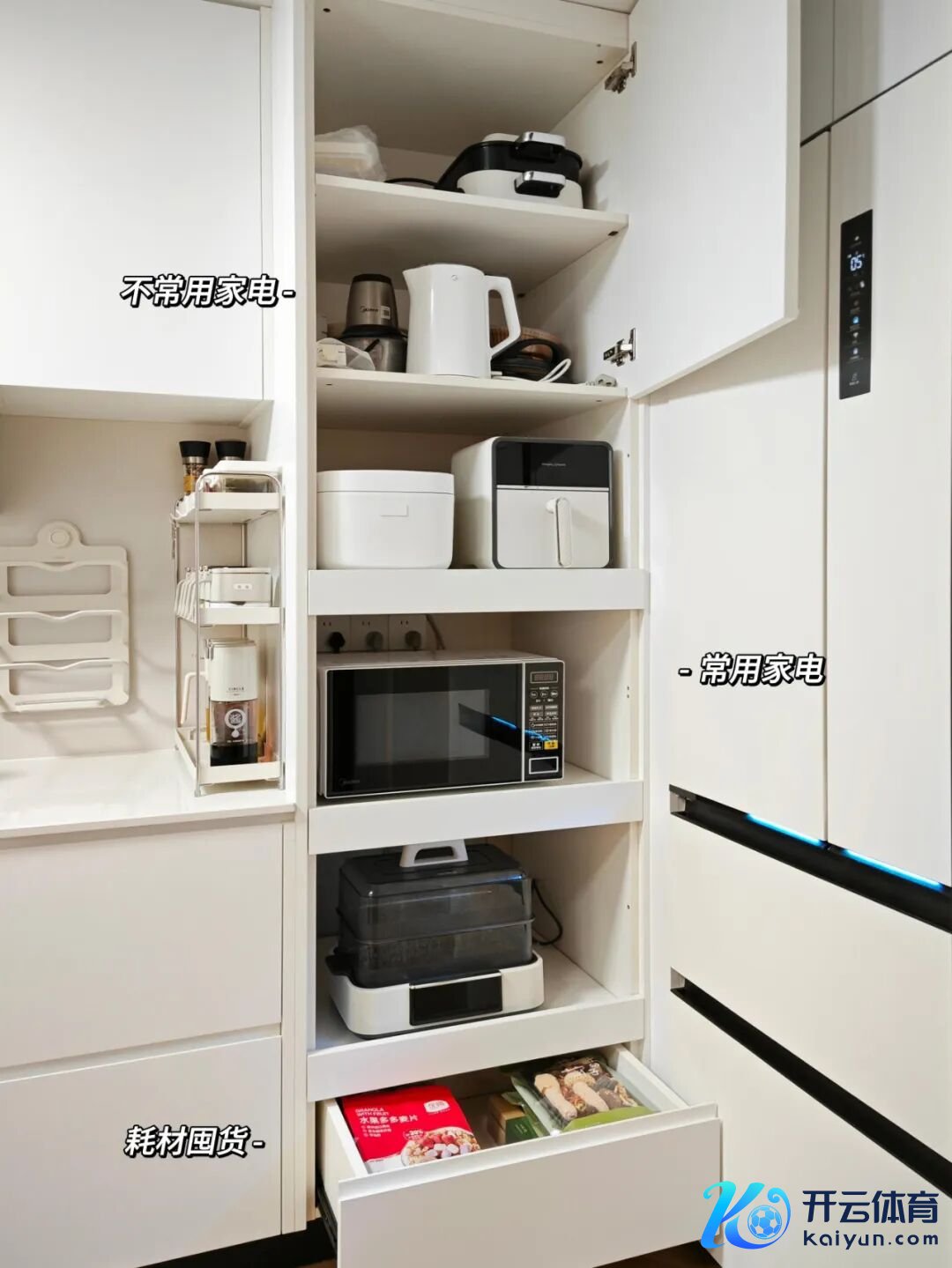 比如定制橱柜时,筹算一组电器高柜,欺诈垂直空间给小家电作念估量收纳,既开释了台面,又整王人调解。