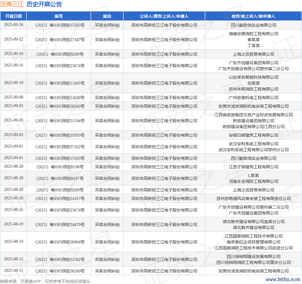 凭证统计,近一年内以深圳市高新投三江电子股份有限公司为当事东说念主的历史开庭公告有293则,其中案由为“商业契约纠纷”的公告以283则居首,其次为“侵害发明专利权纠纷”有3则,“追加、变更被实施东说念主异议之诉”有2则。历史开庭公告(前20条)如下: