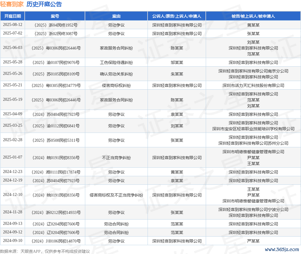 案号:(2025)浙04民终1952号审理法院:浙江省嘉兴市中级东说念主民法院案由:做事争议当事东说念主信息: 原告/上诉东说念主:深圳轻喜到家科技有限公司 被告/被上诉东说念主:黄某某开庭日历:2025年8月12日字据统计,近一年内以深圳轻喜到家科技有限公司为当事东说念主的历史开庭公告有18则,其中案由为“做事争议”的公告以9则居首,其次为“做事协议纠纷”有2则,“家政服务协议纠纷”有2则。历史开庭公告如下: