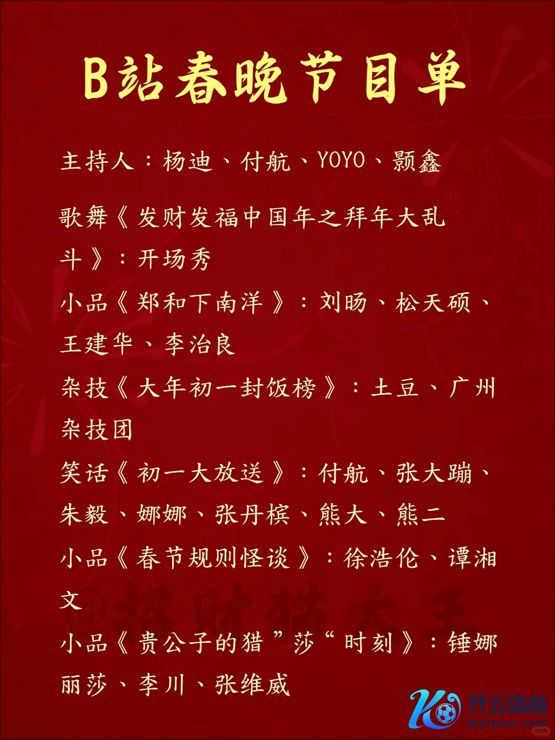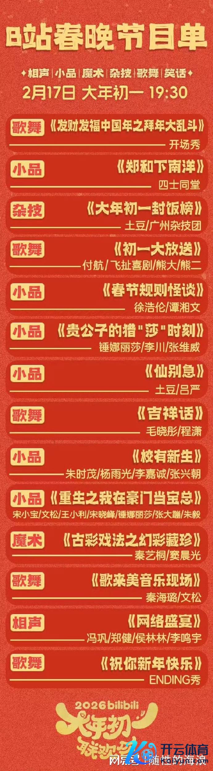 谁懂啊!B 站 2026 年大年月吉联欢会节目单正经曝光,定档 2 月 17 日(正月月吉)19:30,在 B 站、云视听小电视同步直播体育游戏app平台,时长约 2.5 小时,妥妥的春节电子大除夜饭已就位!