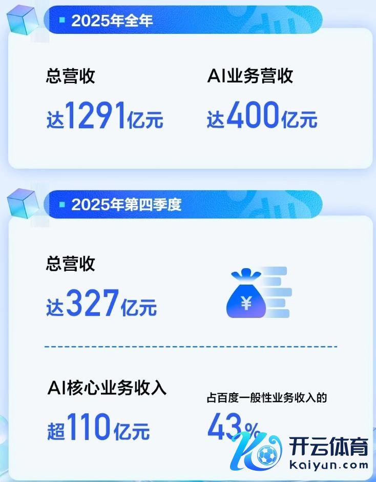 2月26日,百度发布了2025年四季度及全年财报,2025年百度总营收1291亿元,其中AI业务营收为400亿元,占比杰出30%。四季度AI中枢业务收入杰出110亿元,占一般性业务收入比例为43%。这一占比进展超出市集预期。