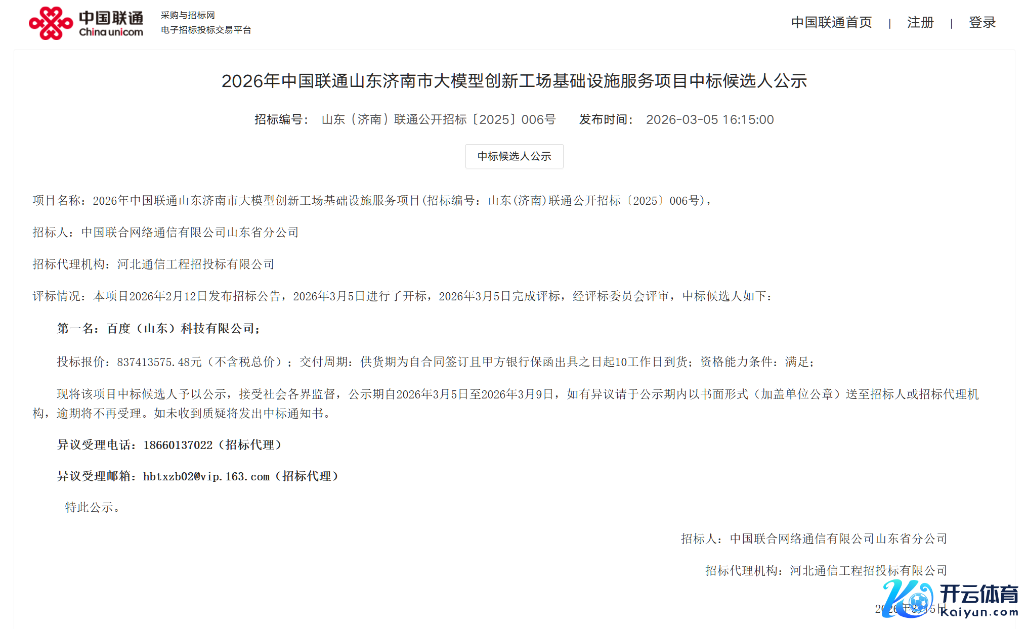 智东西3月6日讯息,昨六合午,中国联通发布2026年山东济南市大模子翻新工厂基础面貌办事表情中标公告,百度中标,金额为8.37亿元。