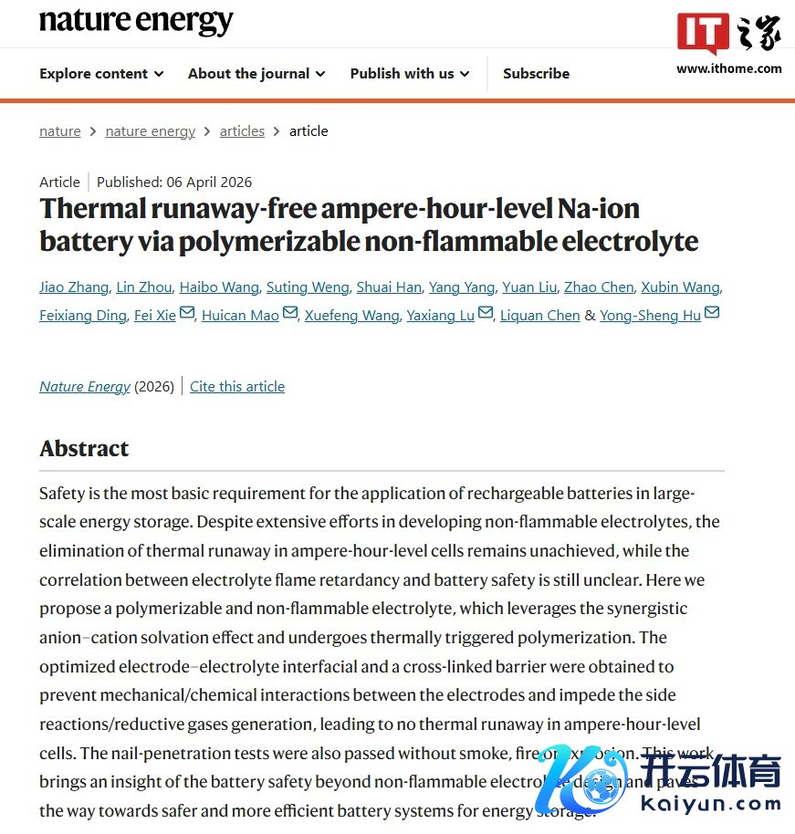 IT之家 4 月 6 日音书开yun体育网,空洞科技日报报说念和中科海钠当天共享,中国科学院物理连络所、中科海钠胡勇胜连络员团队得胜缔造出一种具有自戍卫功能的可团聚不燃电解质(PNE),大家初次在安时级钠离子电板中兑现透顶阻断热失控。
